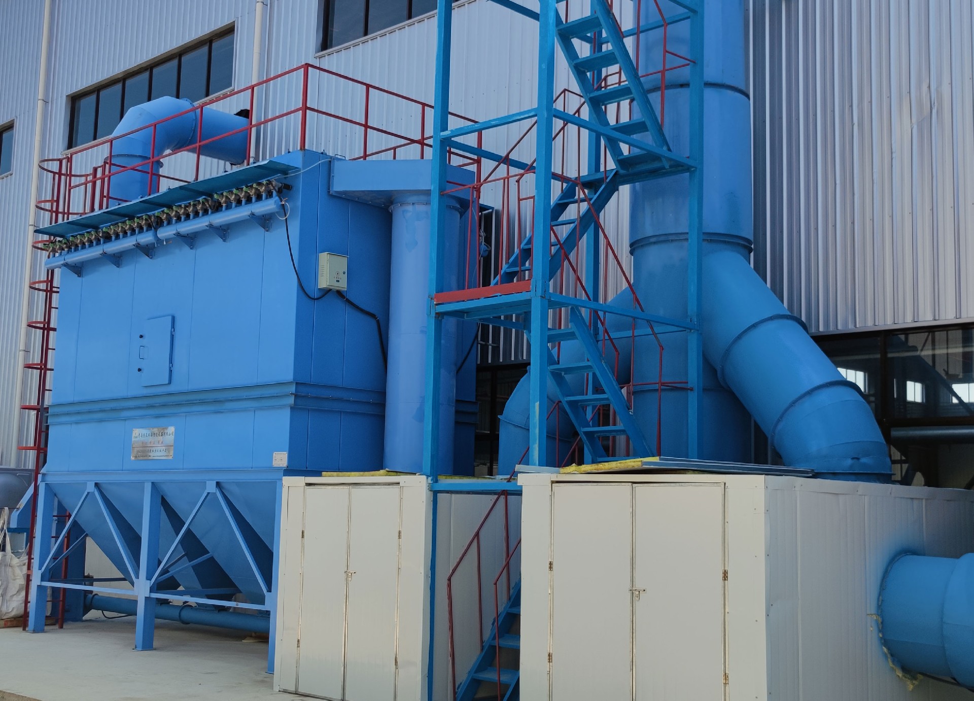 電爐除塵器裝置系統(tǒng)為:將來自工業(yè)硅生產(chǎn)電爐的煙氣,在離心式主風機的抽吸作用下,煙氣由半封閉式電爐內(nèi)引出,沿著煙道首先進入旋風除塵器。把粗粒、火星分離出來,使其沉降于灰斗至卸料器排出。在有旋風除塵器的出口排出,超細粉塵及含塵氣體進入一個熱交換器,風冷降低煙氣溫度,然后其它塵粒隨氣流上升進入布袋除塵器各個袋室。經(jīng)濾袋過濾后,粉塵被阻留在濾袋外面,凈化后的氣體由濾袋進入箱體,再通過袋口和上箱體(凈氣室)出風口進入離心式主風機在排入煙囪至大氣?;叶分械姆蹓m定時或連續(xù)由卸灰系統(tǒng)排出。
