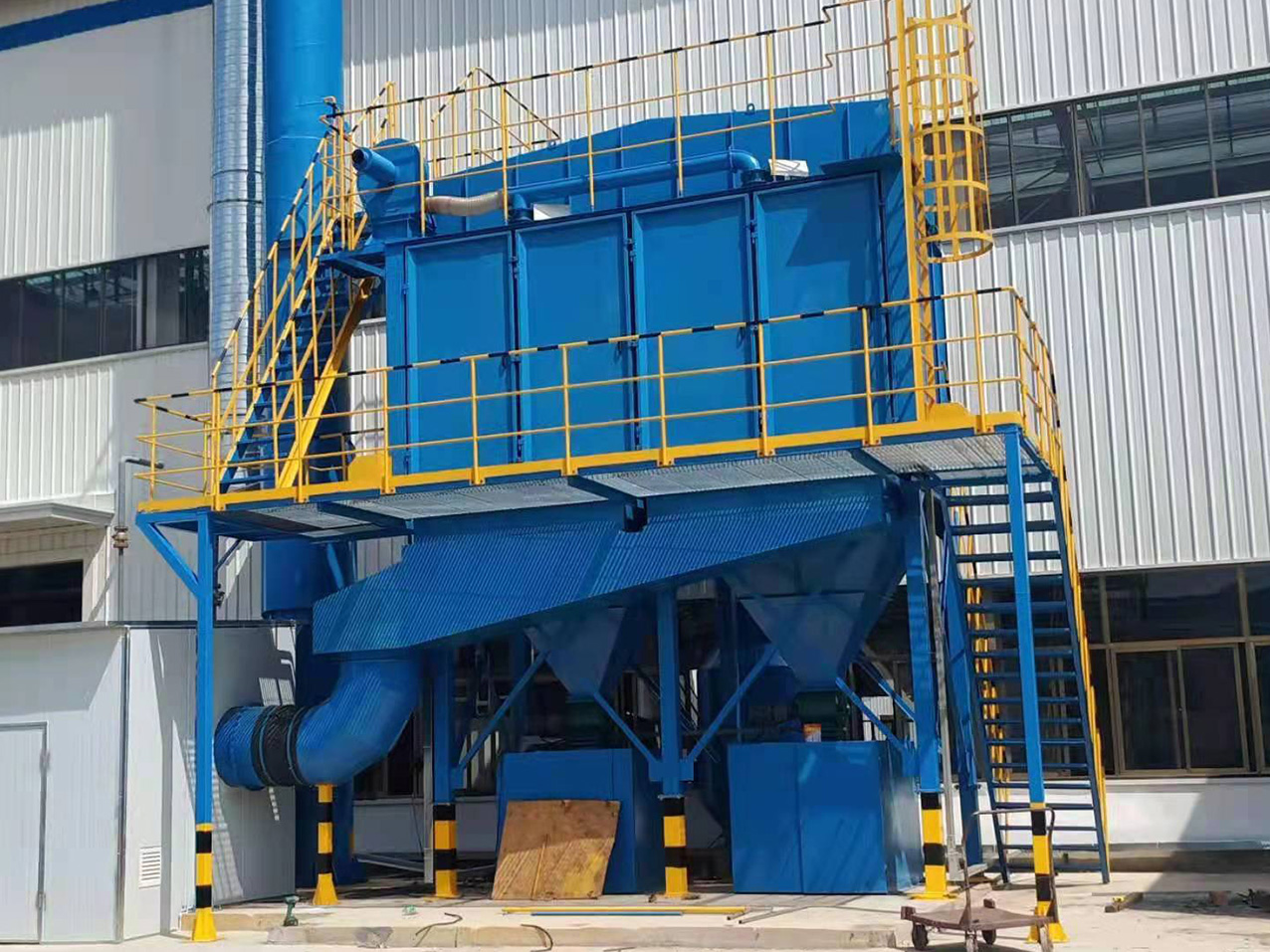 電爐除塵器裝置系統(tǒng)為:將來自工業(yè)硅生產(chǎn)電爐的煙氣,在離心式主風機的抽吸作用下,煙氣由半封閉式電爐內(nèi)引出,沿著煙道首先進入旋風除塵器。把粗粒、火星分離出來,使其沉降于灰斗至卸料器排出。在有旋風除塵器的出口排出,超細粉塵及含塵氣體進入一個熱交換器,風冷降低煙氣溫度,然后其它塵粒隨氣流上升進入布袋除塵器各個袋室。經(jīng)濾袋過濾后,粉塵被阻留在濾袋外面,凈化后的氣體由濾袋進入箱體,再通過袋口和上箱體(凈氣室)出風口進入離心式主風機在排入煙囪至大氣?;叶分械姆蹓m定時或連續(xù)由卸灰系統(tǒng)排出。